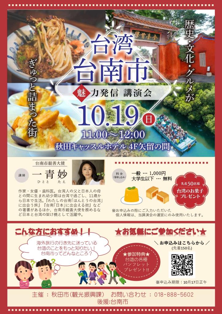 秋田市では、市民の方に台湾や台南市の魅力を紹介することを目的に標記講演会を開催します。