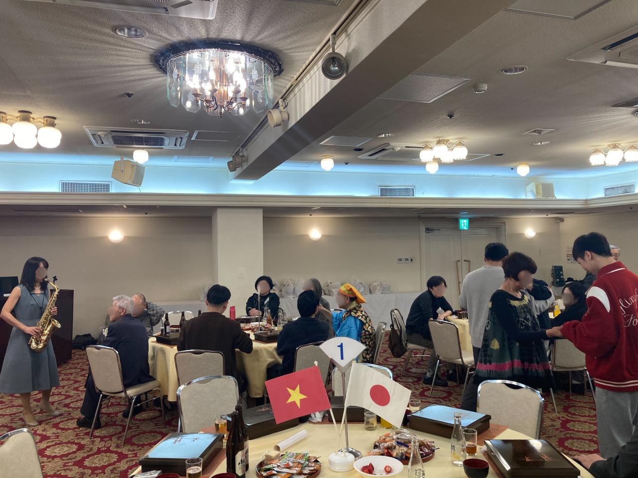 当日は、ベトナム流の乾杯の発声を皮切りに会食が始まり、サックス演奏や社交ダンス、南京玉すだれなど、多彩な余興が披露されました。最後はベトナム人留学生の皆さんによるベトナムの歌と日本の歌を披露もあり、会場は大いに盛り上がりました!