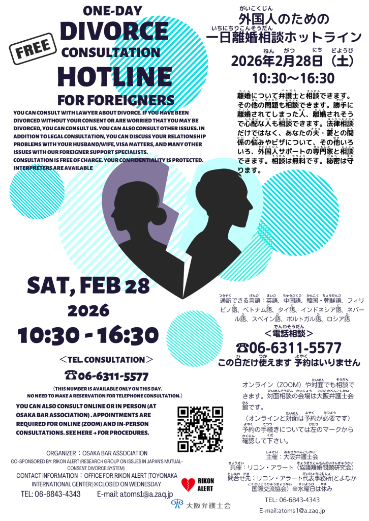 <Tel. consultation> ☎06-6311-5577 This number is available only on this day. No need to make a reservation for telephone consultation. We can also call you back. <online/in person > You can also consult online or in person (at osaka bar association) . Appointments are required for online (ZOOM) and in-person consultations. See Details → https://atoms9.wixsite.com/rikon-alert/english |