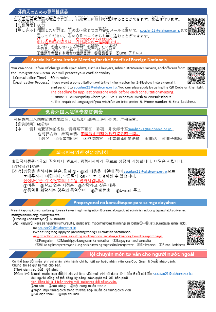 영주 신청에 필요한 조건과 제출 서류에 대해 자세히 알고 싶다. 일본인 남편이 남긴 재산의 상속에 대해 상담하고 싶다… 등 다양한 고민거리에 대해 변호사나 행정서사와 상담할 수 있습니다.