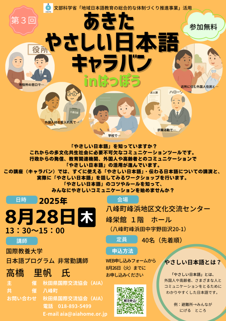 3回目となる「あきた やさしい日本語キャラバン」は、八峰町での開催です。近隣市町村にお住いの方もぜひご参加ください!