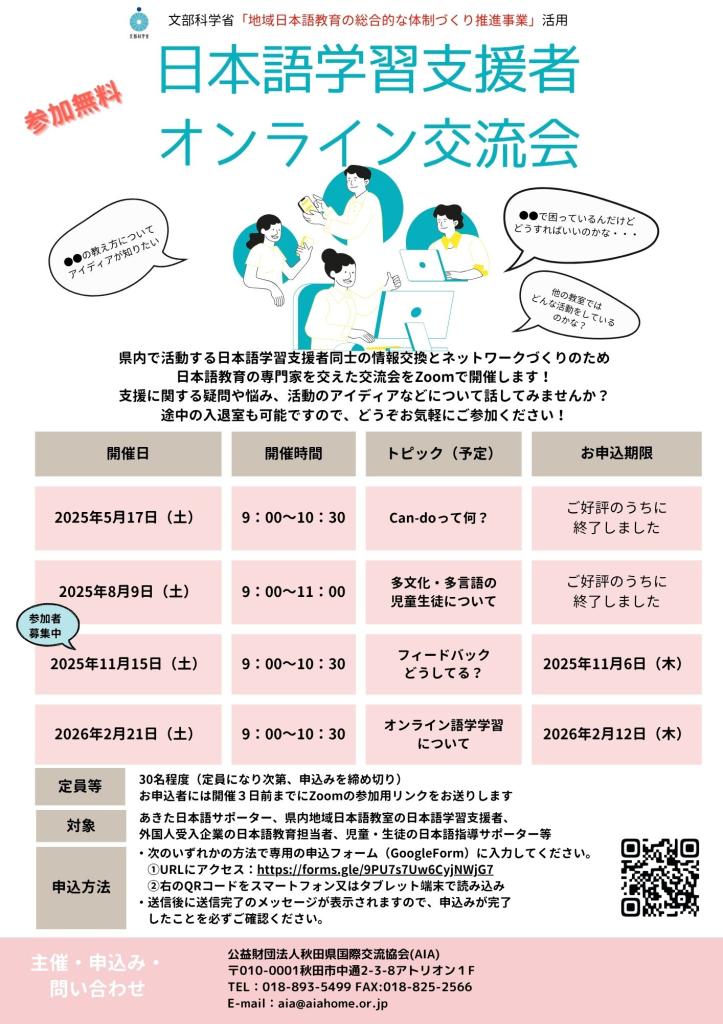 AIAでは、県内で活動している日本語学習支援者同士の情報交換とネットワークづくりのため、日本語教育の専門家を交えたオンライン交流会を定期的に行っており、今年度3回目となる交流会を次のとおり開催いたします。
