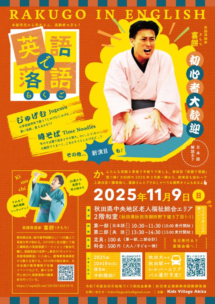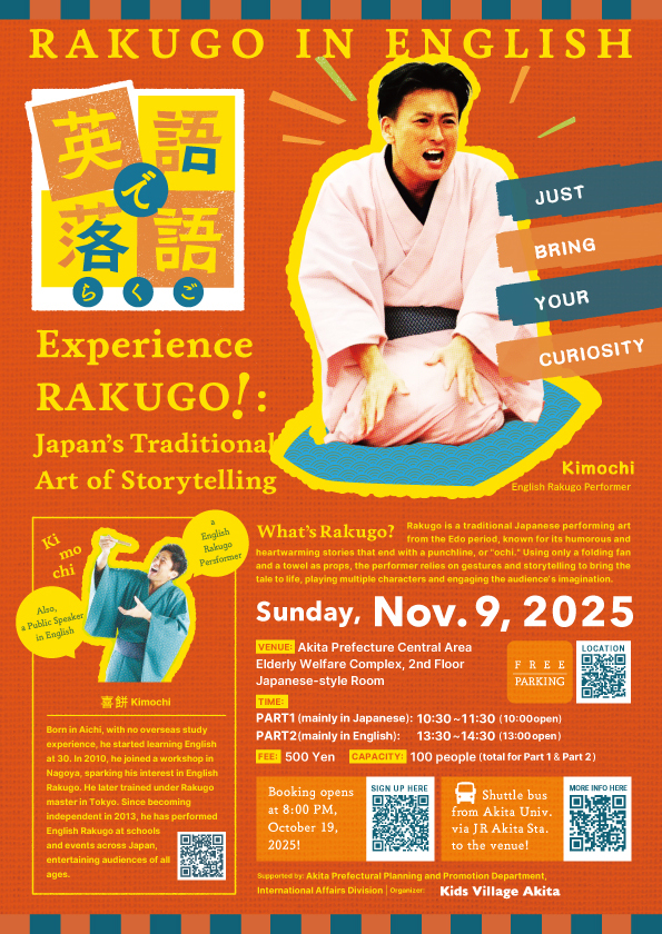 10月19日(日)20時申込開始!google formにて 【英語で落語】お申込フォーム【Rakugo in English!】Application Form *オンラインでのお申し込みが難しい方は、当日先着順にて若干名お席を用意しております。直接会場にお越しください。 October 19 (Sun) at 8:00 PM via Google Form: 【英語で落語】Application Form【Rakugo in English!】Application Form *If online registration is difficult, a few seats will be available on the day (first come, first served). Please come directly to the venue. |