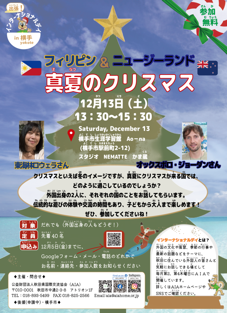 フィリピンとニュージーランド出身のゲストお2人 をお招きし、それぞれの国のことをお話してもらいます。