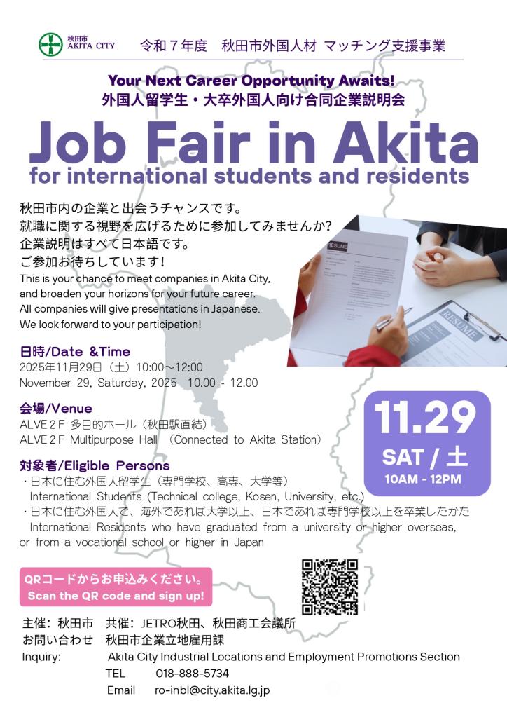 Akita City will hold the job fair for international students and residents with a university degree or higher who wish to work for companies in Akita City.