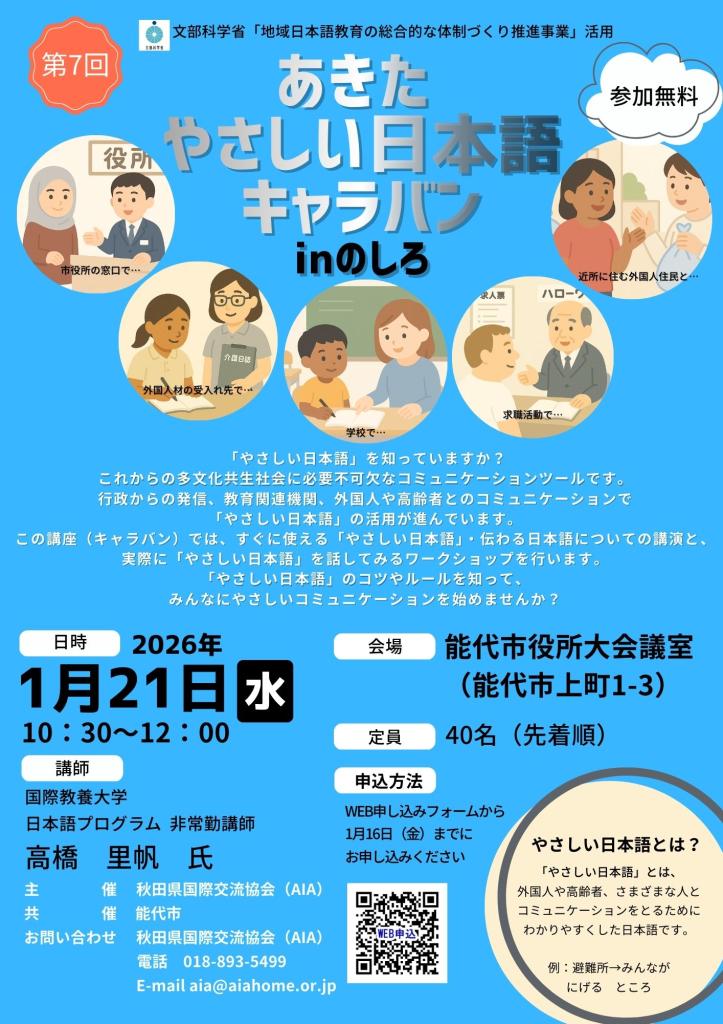 7回目の「あきた やさしい日本語キャラバン」は、能代市での開催です。近隣市町村にお住いの方もぜひご参加ください!