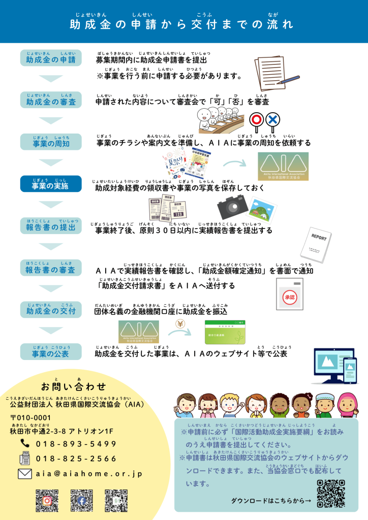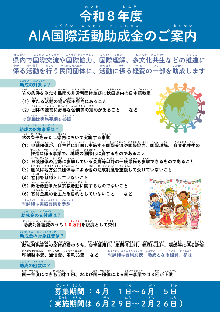 (公財)秋田県国際交流協会では、秋田県内において国際交流や国際協力、国際理解、多文化共生等の推進に係る活動を行う民間団体に対し、その活動に係る経費の一部を助成しています。事業を計画しているみなさまのご応募をお待ちしています。