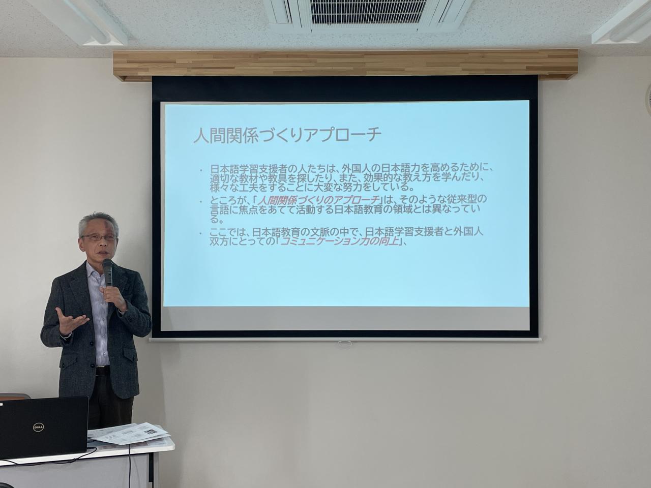 初心者向け講座の2日目では、「地域日本語教室ってどんなところ?」と題し、伊東祐郎先生に講義を行っていただきました。参加者同士がお互いを知るためのアイスブレイクでは「助詞」を使わない自己紹介に挑戦。助詞を使わずに話すことが難しいということ、同時に、助詞を除いて話しても十分にコミュニケーションが可能という発見がありました。この体験から、文法指導にこだわり過ぎない学習支援のありかた、可能性について、伊東先生からの問題提起がありました。母語は自然習得するものなので、自分の言語の何が母語話者以外の人々にとって難しいのか気づきにくい。学習者の立場になって学習支援をすることは、一方的に「教える」ということではなく、支援者自身も自分の母語を知り、相手の言語を知る、「双方向」の活動になるのではないか…。学習支援という活動を、自分がどう捉えるかによって、支援の内容も効果も変わってきそうです。