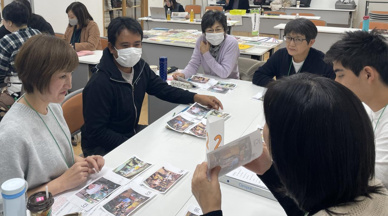 午後は、実際に地域に暮らしている在住外国人3名との交流の時間もありました。普段どんなお店で買い物しているのか、好きな場所は?その理由は?など、「生活マップ」を用いながら会場、Zoomともに、外国人参加者との交流を楽しみました。「フォトランゲージ」活動では、様々なお店、場所で食事する人々の写真を見ながら、それぞれが何を「豊かさ」と感じるか、考えを共有しました。
