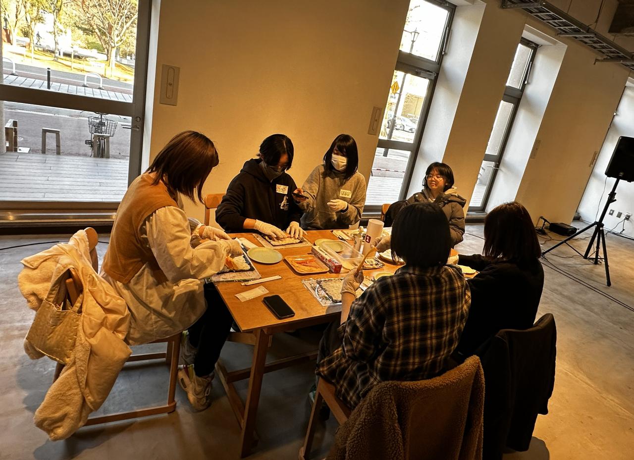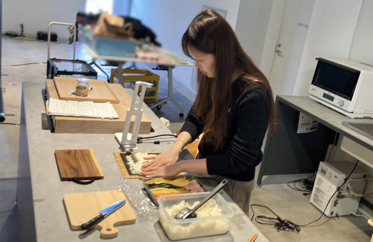 お正月の紹介の後は、皆さんで韓国の海苔巻き「キンパ」を巻いて食べました。宋さんがキンパを巻く姿はまるで職人のようで、会場からも感嘆の声が漏れていました。