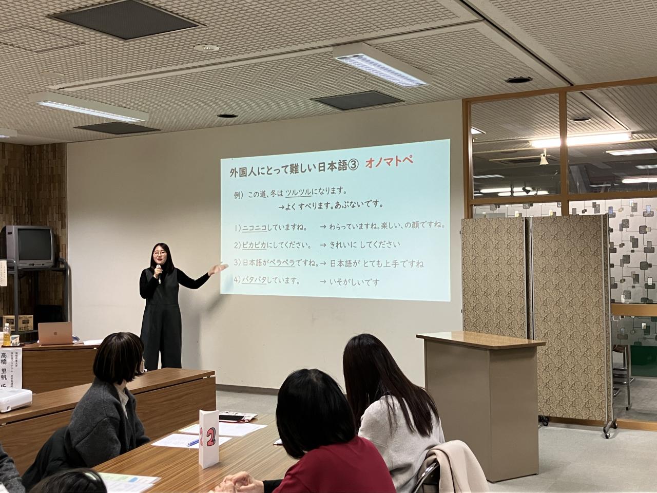 冒頭、動画「(外国人の)新米パパ、母子手帳の申請に市役所に行ったら…」(ご覧になりたい方はぜひ会場で!)を紹介すると、会場からは笑い声も聞こえてきました。似たような経験をお持ちの方がいたのでしょうか!?この動画から、「日本語のどんなところが外国人の方々にとって難しいのか」を学びつつ、会場にいる外国人の方々にも意見を聞いてみました。敬語が難しい、という意見には日本人参加者の皆さんも頷いていましたが、オノマトペ(ザーザー、キラキラ、ゴクゴク…)が難しい、という意見には驚いた様子も。伝わりやすくなると思っていた!という方も多かったようです。