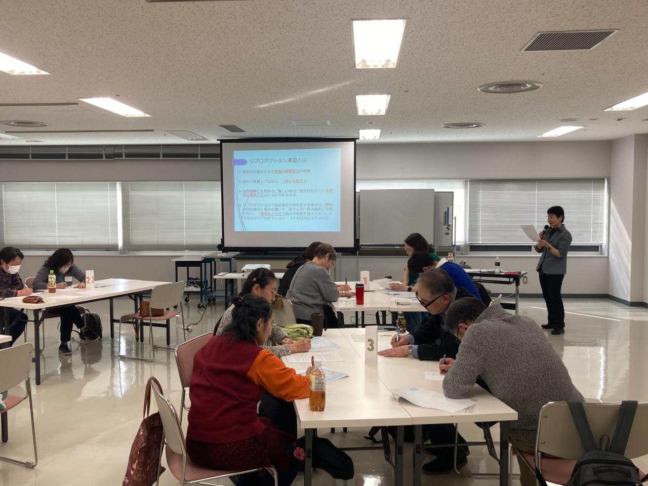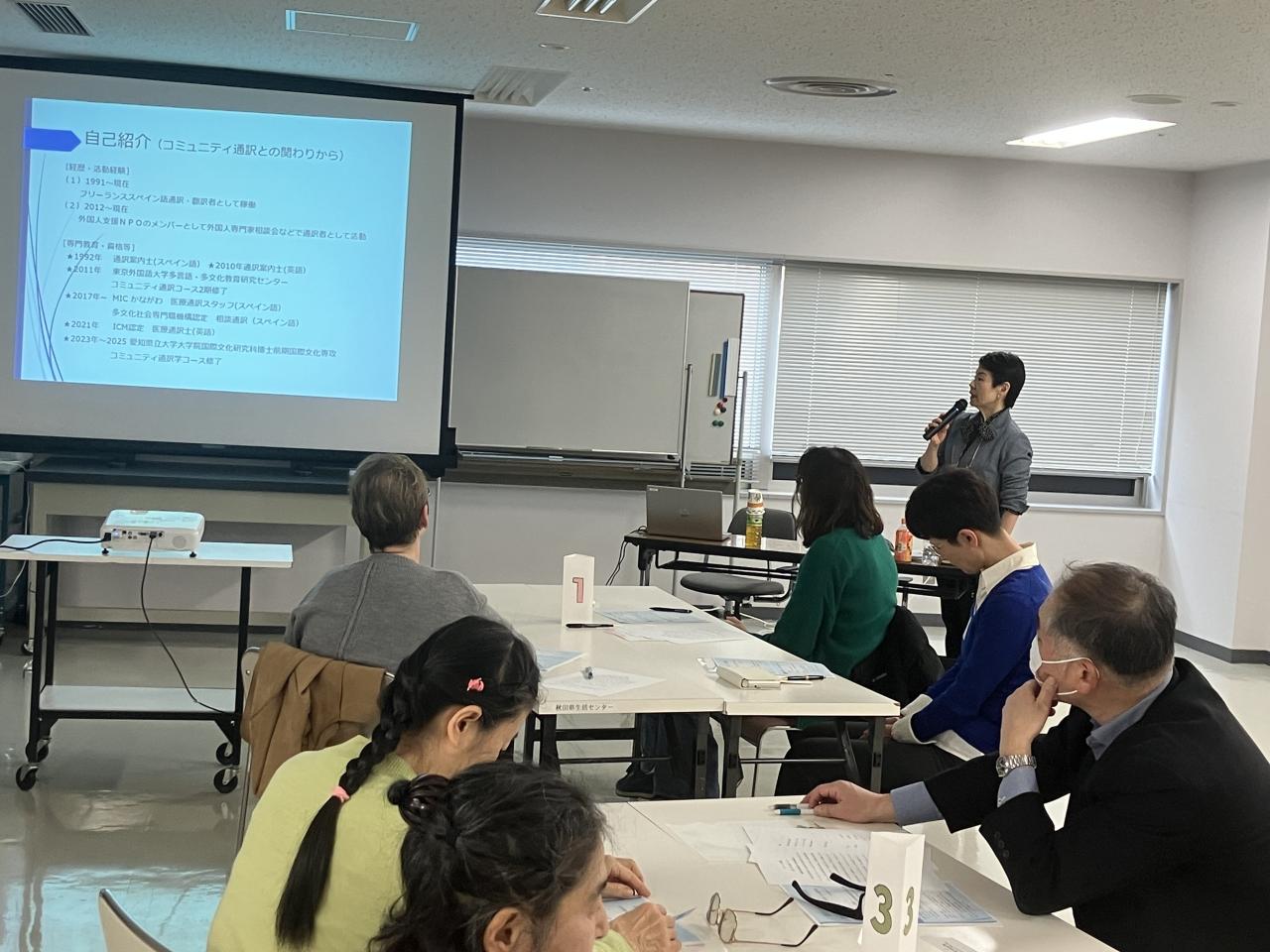 前半の座学では、コミュニティ通訳や通訳を行う際の心構えについて、実体験を交えながらじっくりお話いただきました。休憩を挟んだ後は、いよいよ実践演習へ。通訳の基本的な練習方法や種類について学びました。短期記憶を鍛える「メモリー・エクササイズ」では、苦戦しつつも通訳におけるトレーニングの重要性を実感している様子が見られました。