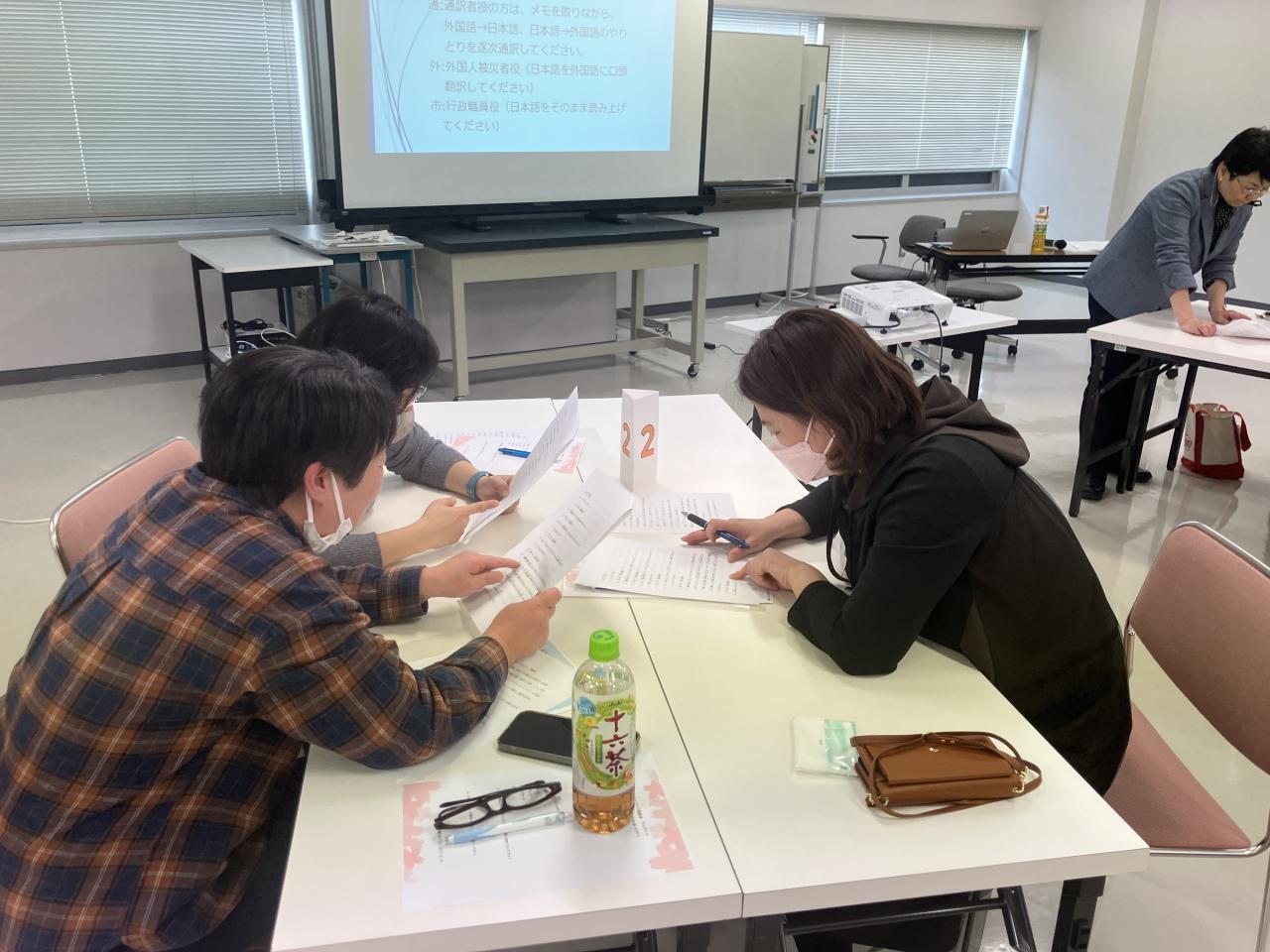演習後半は、災害時を想定したシナリオに基づくロールプレイ演習を実施しました。非日常的な場面設定に戸惑いながらも、会場には活発なやり取りが生まれていました。